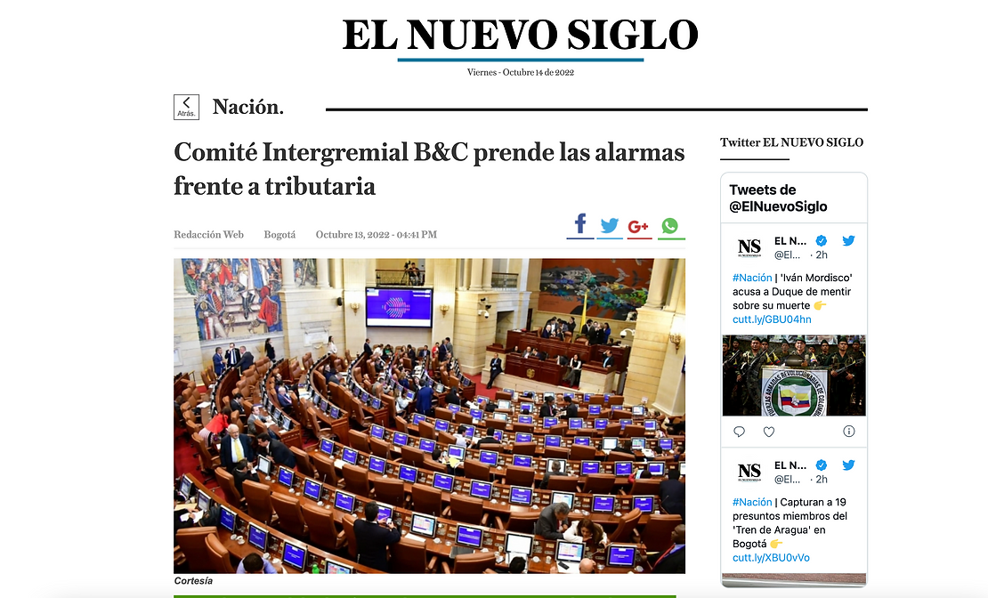 Frente al proyecto de ley de reforma tributaria que se está tramitando en el Congreso de la República, ayer el Comité Intergremial de Bogotá y Cundinamarca hizo un llamado tanto al Ejecutivo como al Legislativo, para que establezcan mecanismos de debate amplio alrededor del mismo y consideren con mucha atención el contexto de desaceleración económica que se avecina.