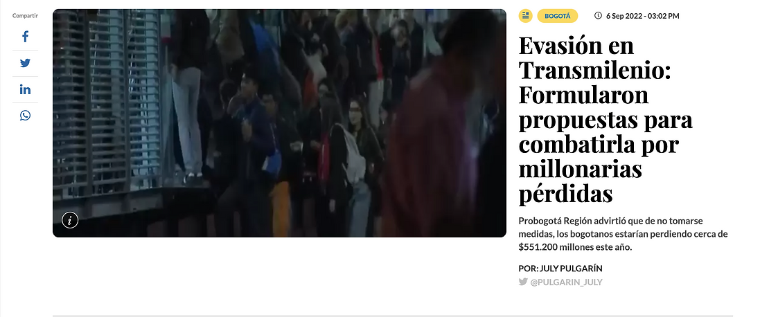 “En definitiva, la evasión va más allá de evitar el pago del pasaje y se relaciona con temas como seguridad, déficit financiero, calidad del servicio, reventa de tiquetes y cultura ciudadana. De ahí que nuestra invitación a la Alcaldía de Bogotá es a que preste especial atención a este fenómeno y trabaje de manera mancomunada desde diversos frentes para evitar estas pérdidas millonarias, nosotros estamos listos para atender el llamado“, aseguró María Carolina Castillo, presidente de Probogotá Región.