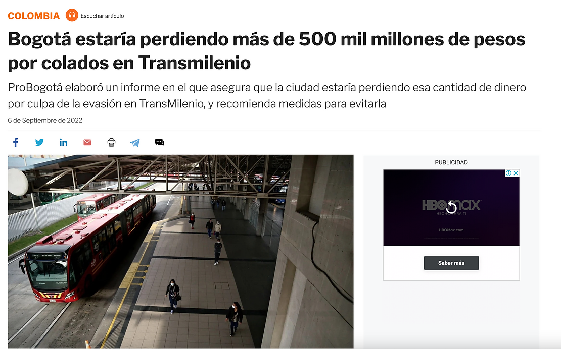 De acuerdo con el ‘Informe de evasión en el componente troncal 2022’ realizado por la Dirección Técnica de Seguridad de Transmilenio, entre el 2019 y el 2022 la evasión pasó de 16.7 % a 29.6 %, representando una pérdida cercana a los $10.600 millones de pesos semanales para el sistema.