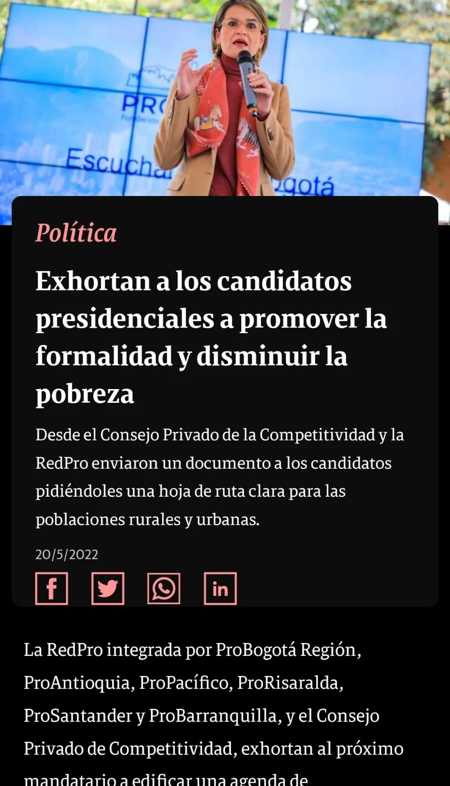 “La RedPro integrada por ProBogotá Región, ProAntioquia, ProPacífico, ProRisaralda, ProSantander y ProBarranquilla, y el Consejo Privado de Competitividad, exhortan al próximo mandatario a edificar una agenda de transformación para construir un mejor contrato entre ciudadanos, empresas y Estado, para así crear condiciones que fomenten la formalidad y disminuyan la pobreza que, según cifras del Dane, impactó a 3,8 millones de personas en 2021”, señala la publicación.