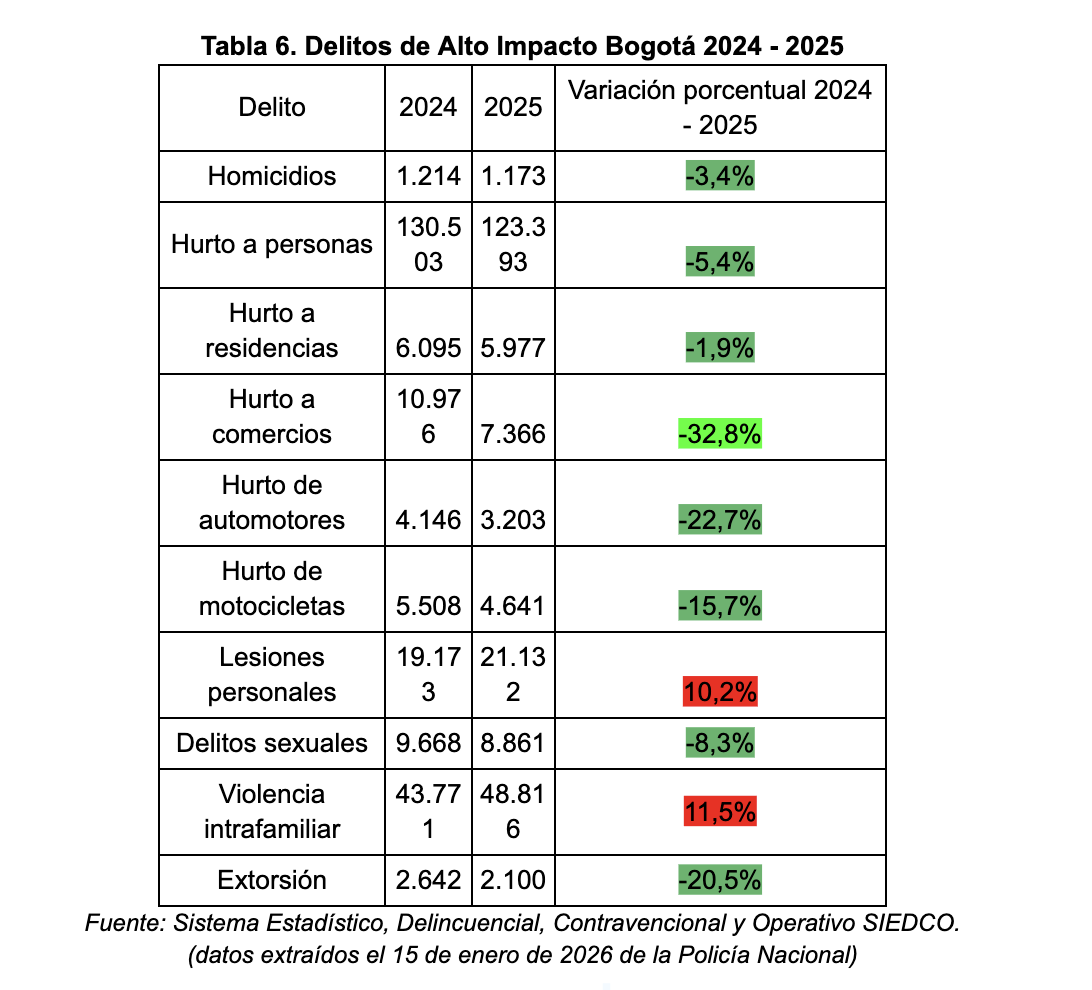 La evidencia muestra que Bogotá no está perdiendo la batalla en todos los frentes, pero sí enfrenta un punto de inflexión. “Hay que hacer un llamado de atención para hablar más de justicia, que los delincuentes cuando cometen delitos sean castigados, ese es el camino, y esta es una de las conclusiones”, afirmó Juan David Quintero, concejal de Bogotá.