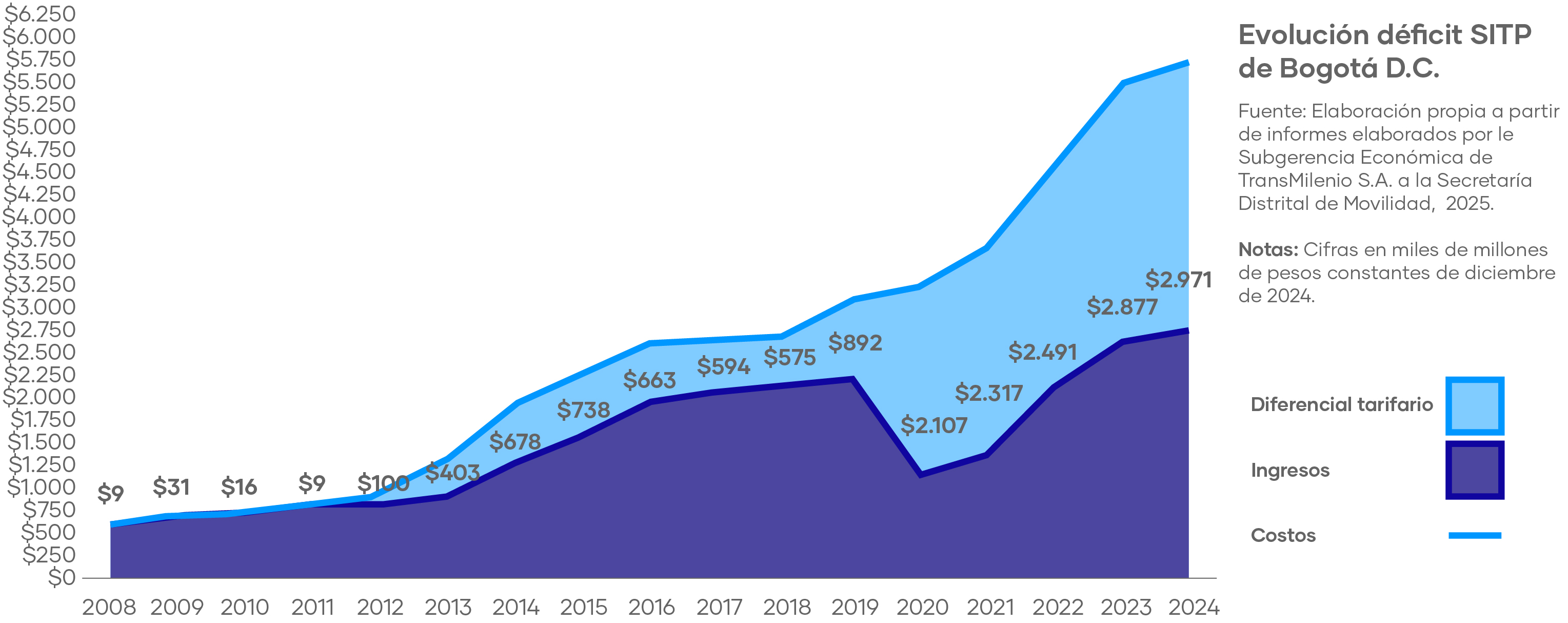 El Sistema Integrado de Transporte Público enfrenta un déficit estructural cercano a los $3,2 billones, explicado por retrasos en infraestructura, actos de vandalismo, los efectos de la pandemia y niveles persistentes de evasión. Para contener este déficit, Bogotá cuenta con el Fondo de Estabilización Tarifaria (FET), un instrumento utilizado en múltiples ciudades del mundo. A través del FET, la ciudad financia cerca del 50 % del costo real de los pasajes, lo que permite que el usuario pague solo una fracción del valor real de cada viaje, mientras el resto se cubre con recursos públicos