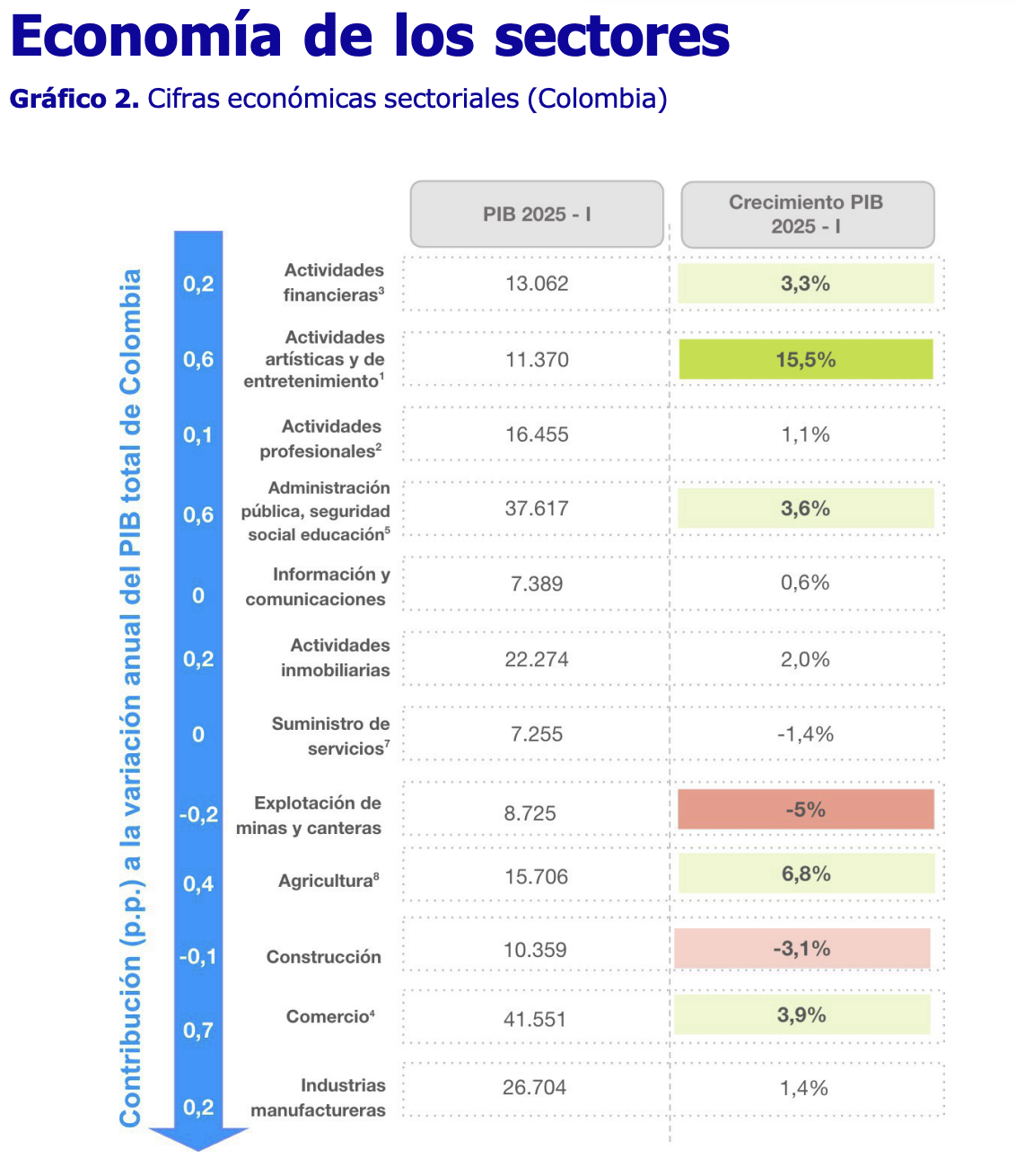 Un análisis de la producción sectorial de Colombia del segundo trimestre del 2025 muestra que los sectores que más crecieron fueron: comercio al por mayor y al por menor (3,9 %), industrias manufactureras (1,4 %) y actividades artísticas y de entretenimiento (15,5 %). Por otro lado, se registraron contracciones en explotación de minas y cantera (-5%), construcción (-3,5 %) y suministro de electricidad, gas, vapor y aire acondicionado (-1,2 %).