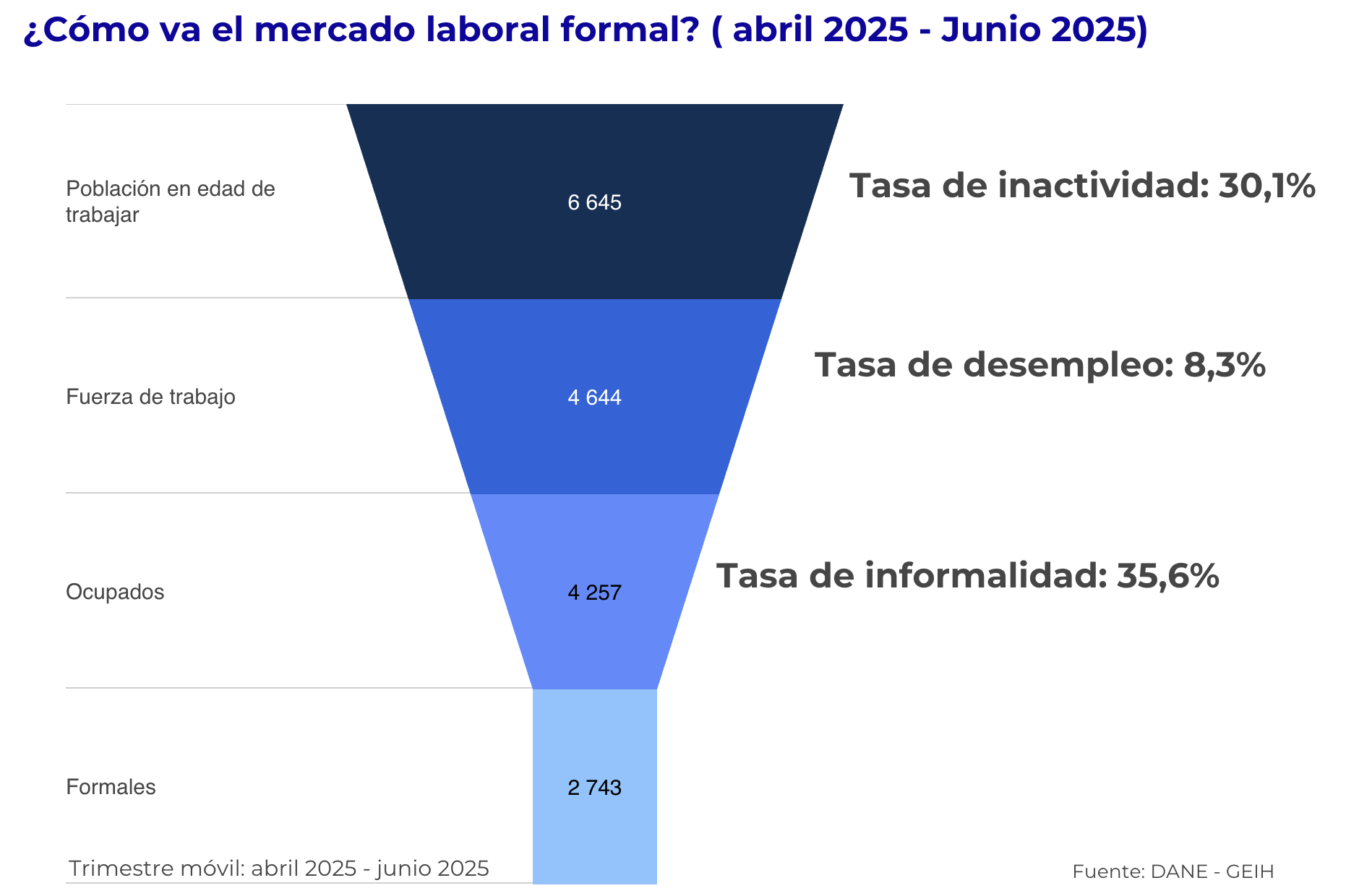 Para el trimestre móvil de abril de 2025 a junio de 2025, la población en edad de trabajar en la ciudad corresponde a 6,64 millones de personas, mientras que la fuerza laboral se situó en 4,64 millones. De estos, el 8,3 % está desempleado, una cifra que disminuyo en comparación con el trimestre móvil anterior (8,7 %) y disminuyo respecto al mismo periodo del año anterior (10,1 %). Esto resulta en 4,25 millones de bogotanos ocupados.