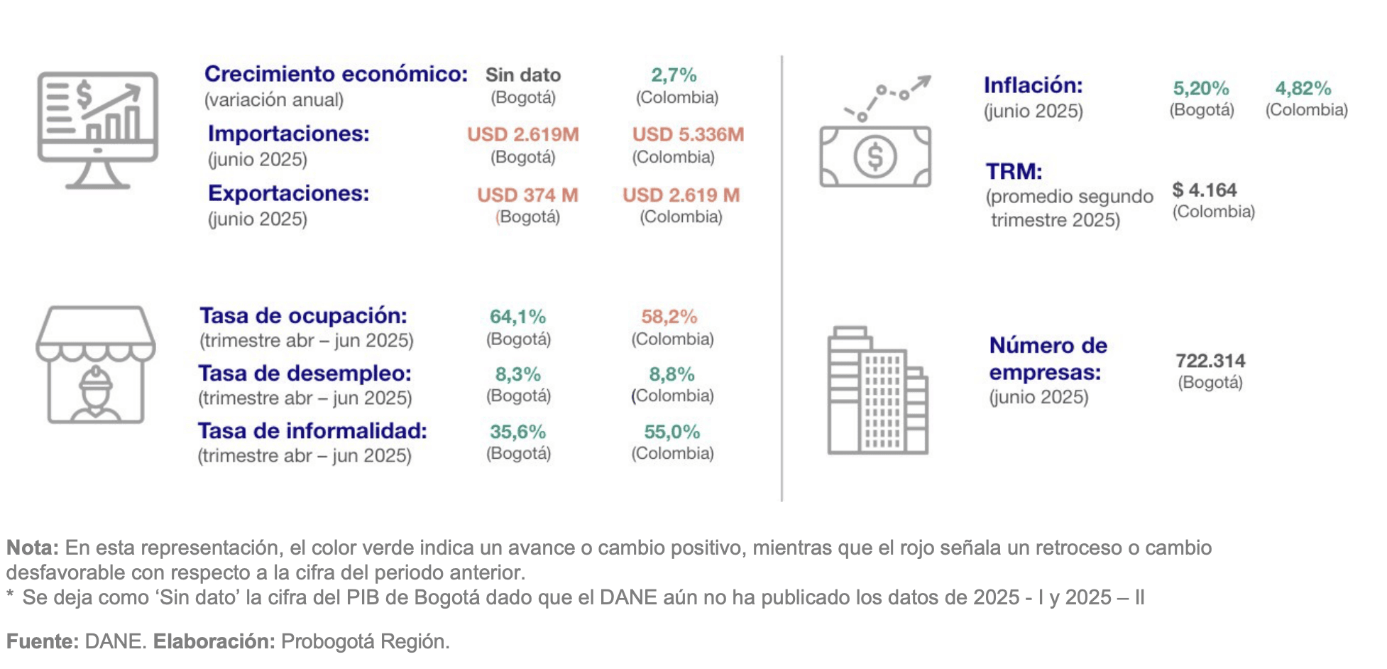 Durante el segundo trimestre de 2025, la tasa de desempleo en Bogotá se ubicó en 8,3 %, con un total de 4.257 miles de personas ocupadas. El Producto Interno Bruto (PIB) nacional registró un crecimiento del 2,1% frente al mismo trimestre de 2024.. En el caso de Bogotá, el DANE no ha publicado estas cifras. Por eso utilizamos el Indicador Trimestral de Actividad Económica Departamental (ITAED) que para el primer trimestre tuvo una variación anual, lo que sugiere que el crecimiento económico de la ciudad se mantiene por encima del promedio nacional.
